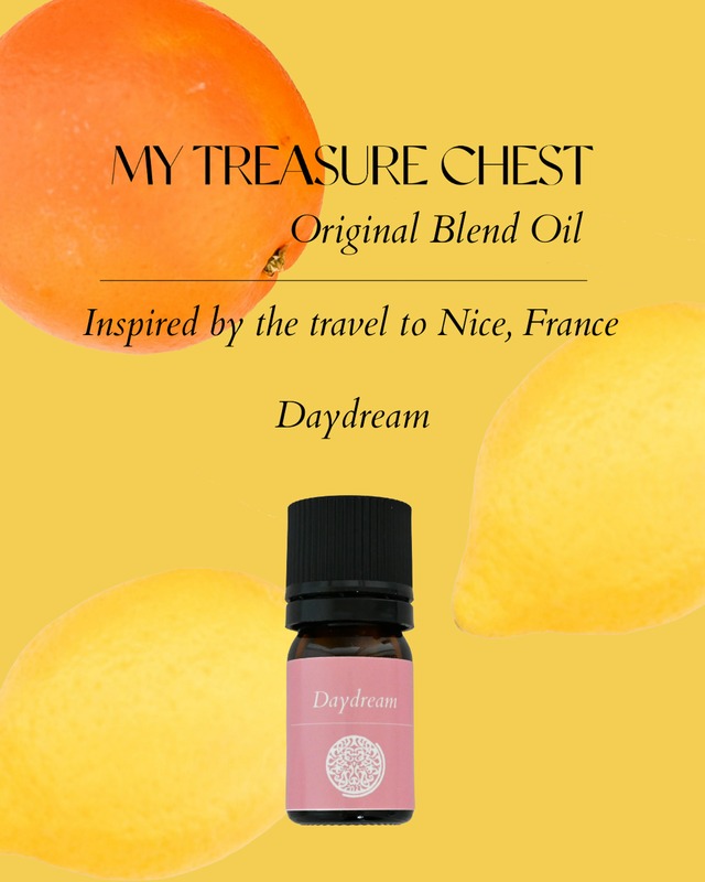 ~My Treasure Chest オリジナルブレンドオイル~ このブレンドオイルは旅先からのインスピレーションを元にブレンドした香りです。 今回の旅先は南フランスのニース。 二度目の訪問を前に、旅の途中香りを楽しめるようブレンドした香りです。 香りのラインナップは全部で三種類。 朝の目覚めにおすすめの Morning Shine。 https://mtcaroma.base.ec/items/114269859 自分との時間を取りたい時におすすめの Self-date。 https://mtcaroma.base.ec/items/114767782 夢見心地で過ごしたい時、 眠りたいときにもおすすめの Daydream。 https://mtcaroma.base.ec/items/114767798 そして、お得な3種セットもございます。 https://mtcaroma.base.ec/items/116998955 --------------------------------------------------------- 【Daydream】 朝日を浴びながら目が覚めるとき、旅先ではいつも、自分がどこにいるのかわからなくなります。 そんな、まるで白昼夢のように感じる旅をいつもそばで感じられるようなイメージの香りです。苦みのあるネロリの香りを中心にブレンドした香りは、心を落ち着かせ、眠りのサポーターとしてもおすすめです。 しっかりと自分に意識を戻しながらも、その瞬間のひとときを存分に大切にしたい。 そんな意識へと導くような香りです。 使用した精油 オレンジスイート、ベルガモット、ネロリ、マージョラムなど計9種類の精油を使用。